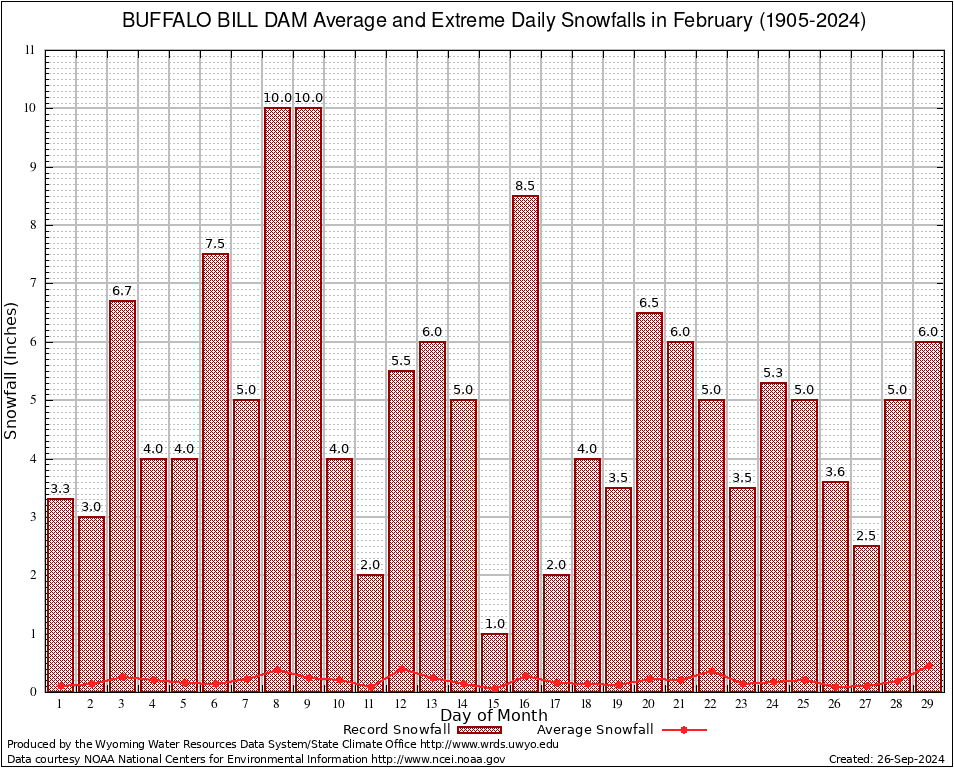February Average and Extreme Daily Snowfall AMounts (1905-2024)