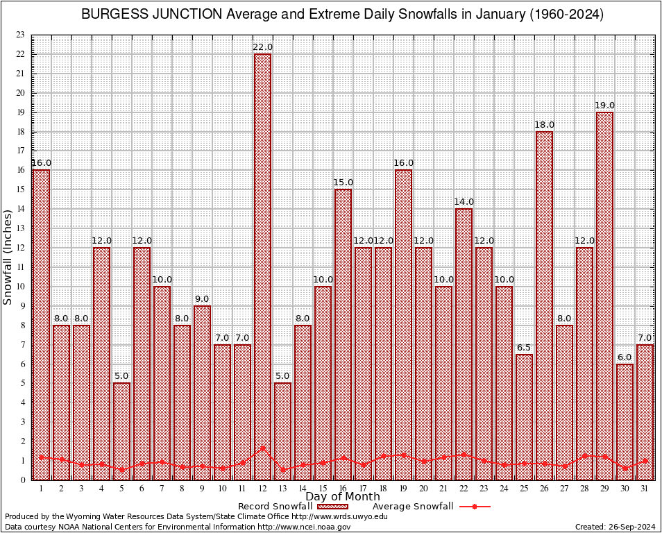 January Average and Extreme Daily Snowfall AMounts (1960-2024)