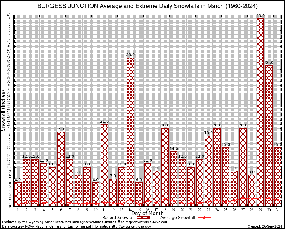 March Average and Extreme Daily Snowfall AMounts (1960-2024)