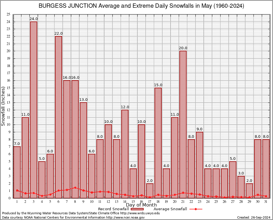 May Average and Extreme Daily Snowfall AMounts (1960-2024)