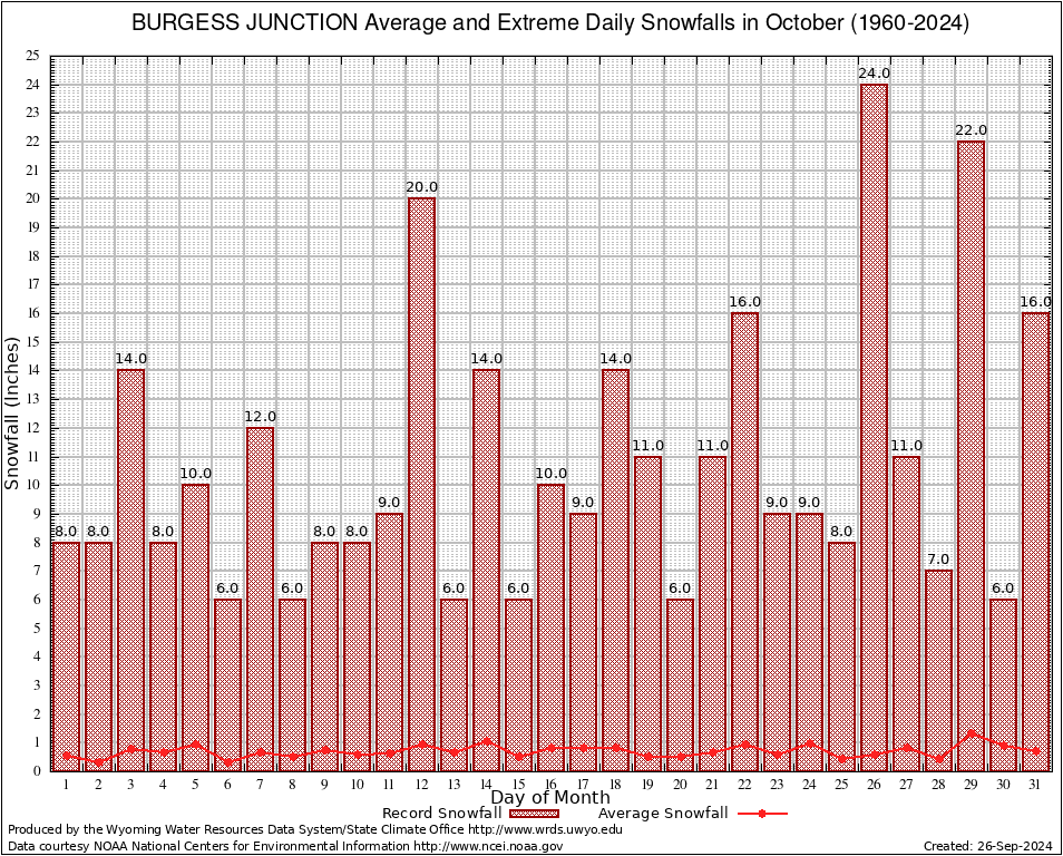 October Average and Extreme Daily Snowfall AMounts (1960-2024)