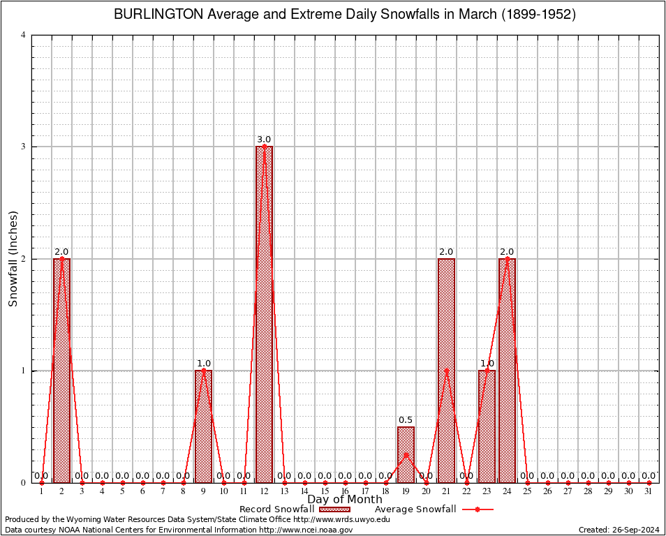 March Average and Extreme Daily Snowfall AMounts (1899-1952)