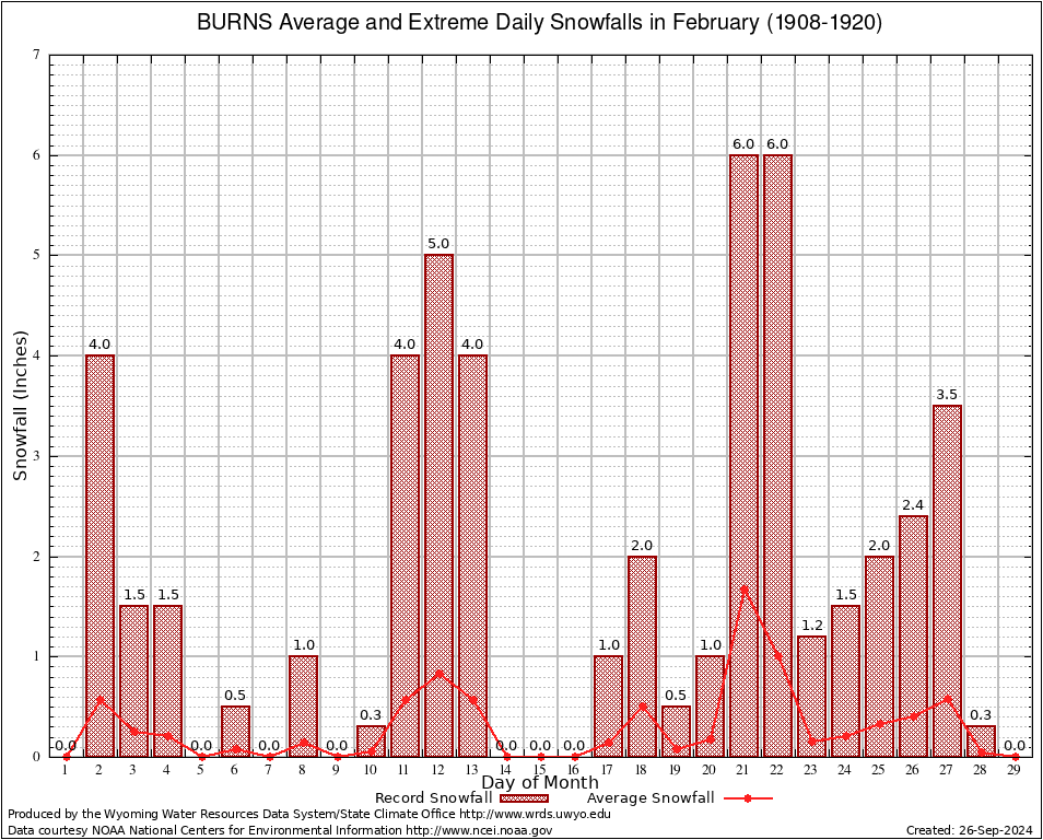 BURNS (481255) February Average and Extreme Daily Snowfall AMounts (1908-1920) To index page for BURNS
