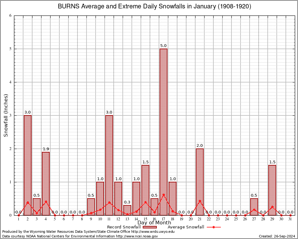 BURNS (481255) January Average and Extreme Daily Snowfall AMounts (1908-1920) To index page for BURNS