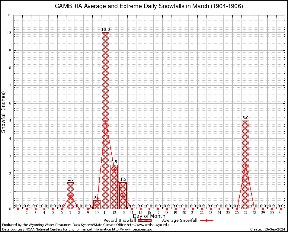 CAMBRIA (481400) March Average and Extreme Daily Snowfall AMounts (1904-1906) To index page for CAMBRIA