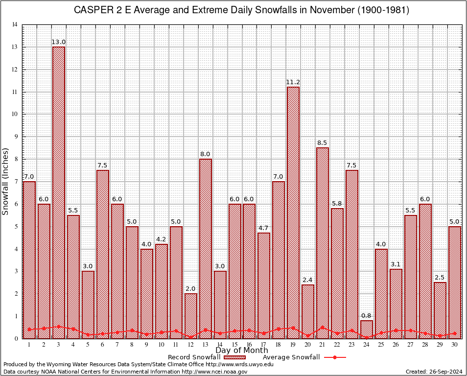 CASPER 2 E (481565) November Average and Extreme Daily Snowfall AMounts (1900-1981) To index page for CASPER 2 E