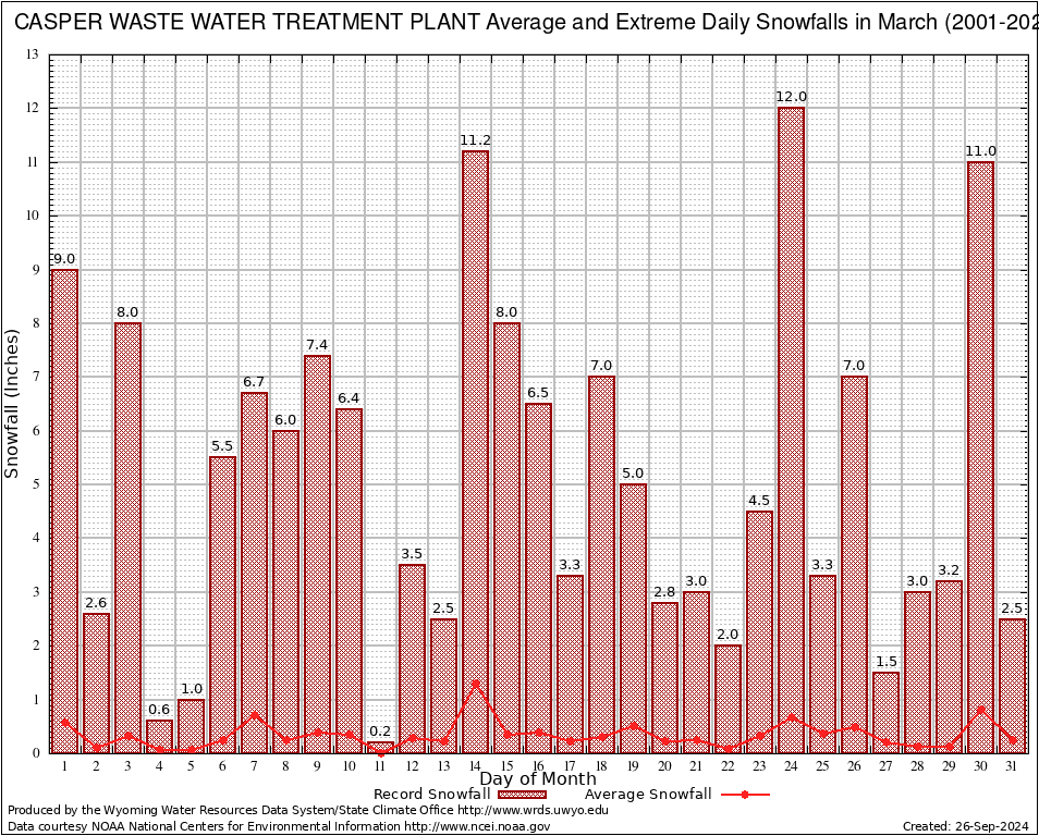 March Average and Extreme Daily Snowfall AMounts (2001-2024)