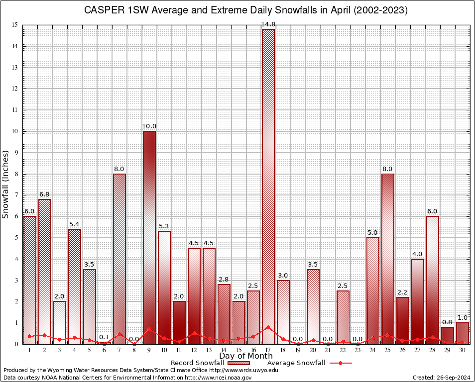 April Average and Extreme Daily Snowfall AMounts (2002-2023)