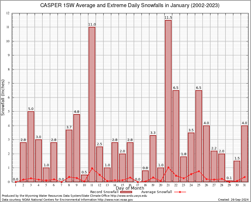 January Average and Extreme Daily Snowfall AMounts (2002-2023)