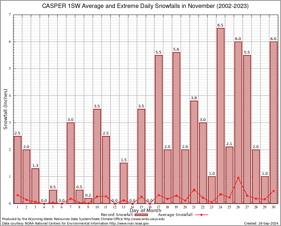 CASPER 1SW (481572) November Average and Extreme Daily Snowfall AMounts (2002-2023) To index page for CASPER 1SW