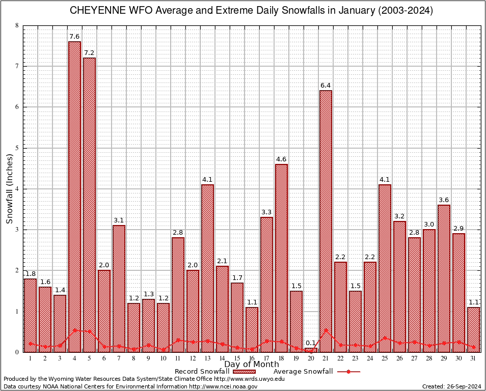 January Average and Extreme Daily Snowfall AMounts (2003-2024)