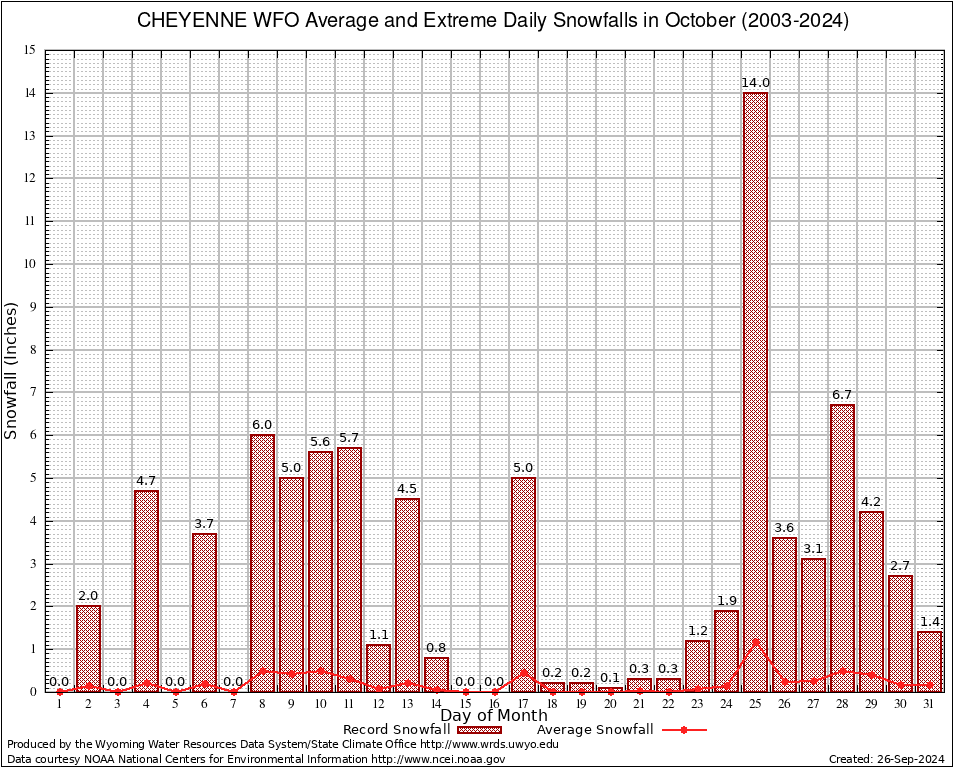 October Average and Extreme Daily Snowfall AMounts (2003-2024)