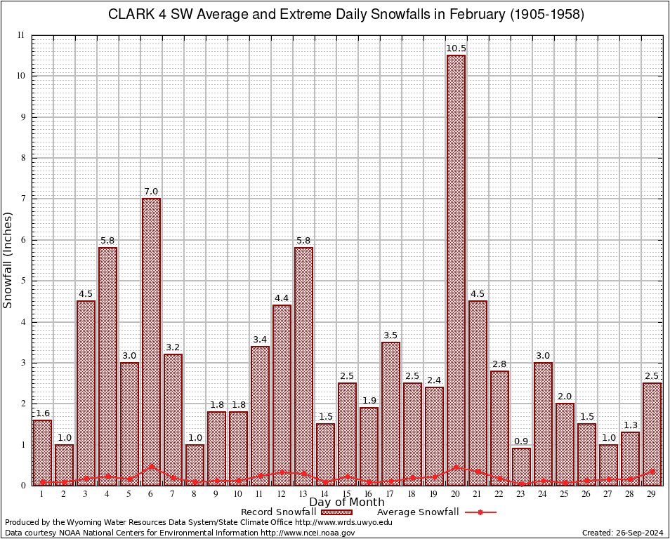 CLARK 4 SW (481770) February Average and Extreme Daily Snowfall AMounts (1905-1958) To index page for CLARK 4 SW