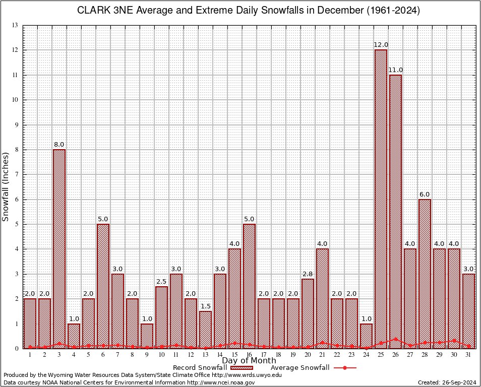 CLARK 3NE (481775) December Average and Extreme Daily Snowfall AMounts (1961-2024) To index page for CLARK 3NE