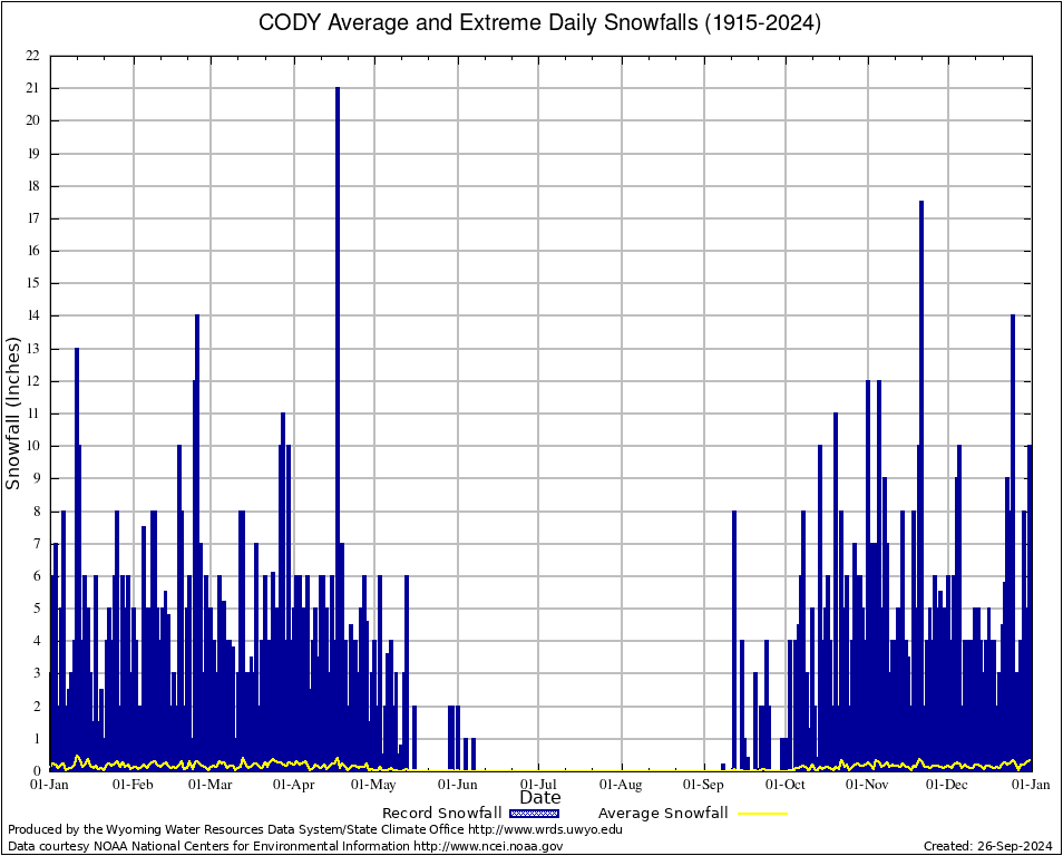 CODY (481840) Annual Average and Extreme Daily Snowfall AMounts (1915-2024) To index page for CODY