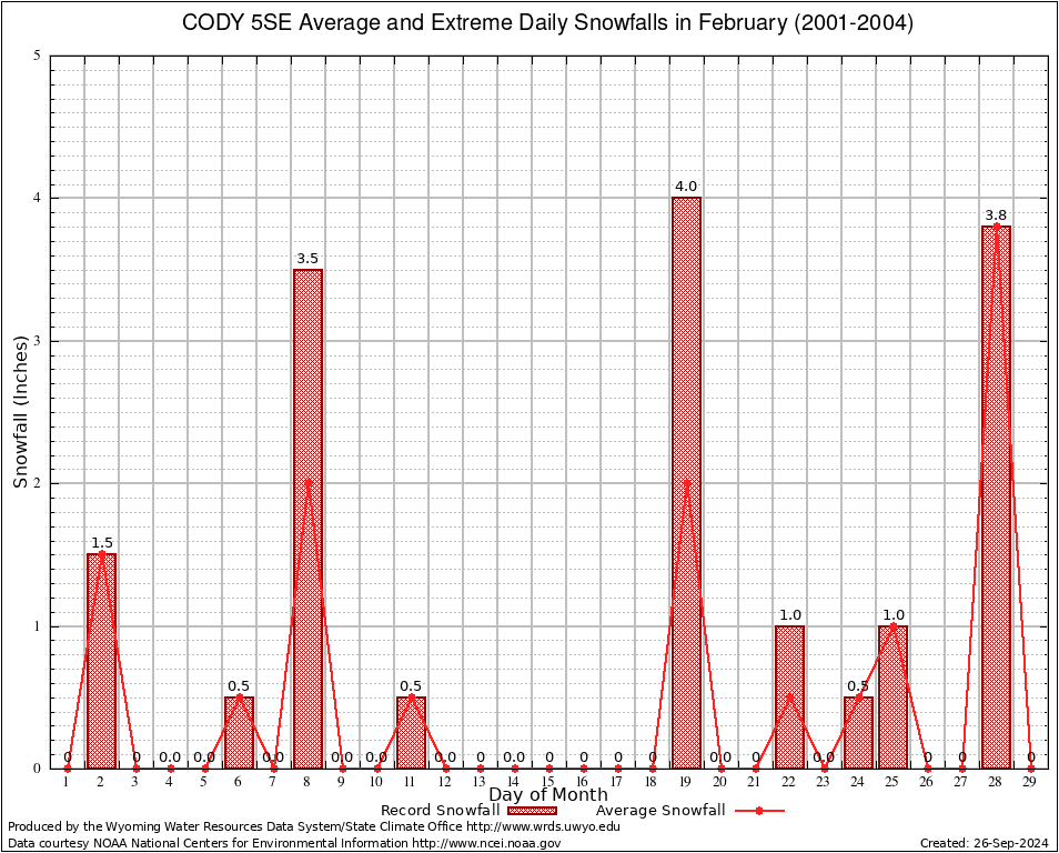 CODY 5SE (481847) February Average and Extreme Daily Snowfall AMounts (2001-2004) To index page for CODY 5SE