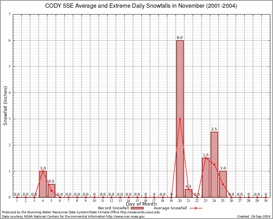 CODY 5SE (481847) November Average and Extreme Daily Snowfall AMounts (2001-2004) To index page for CODY 5SE