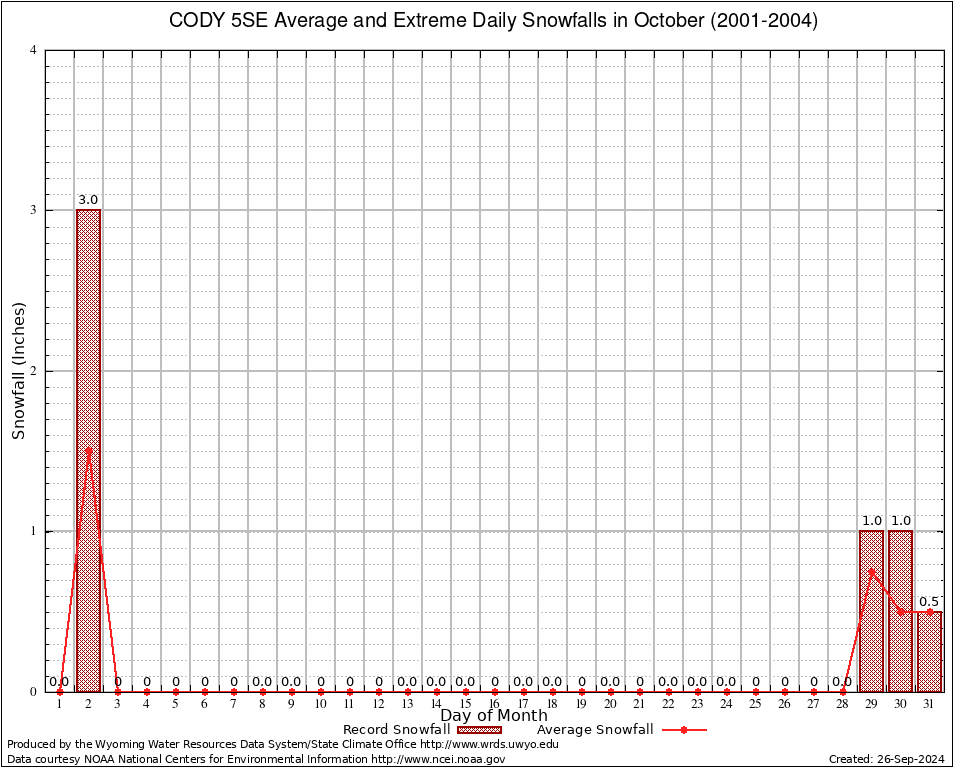 CODY 5SE (481847) October Average and Extreme Daily Snowfall AMounts (2001-2004) To index page for CODY 5SE