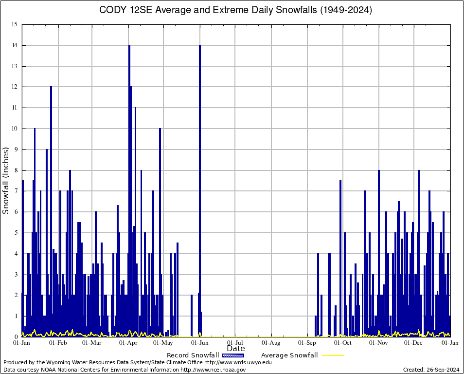 CODY 12SE (481850) Annual Average and Extreme Daily Snowfall AMounts (1949-2024) To index page for CODY 12SE