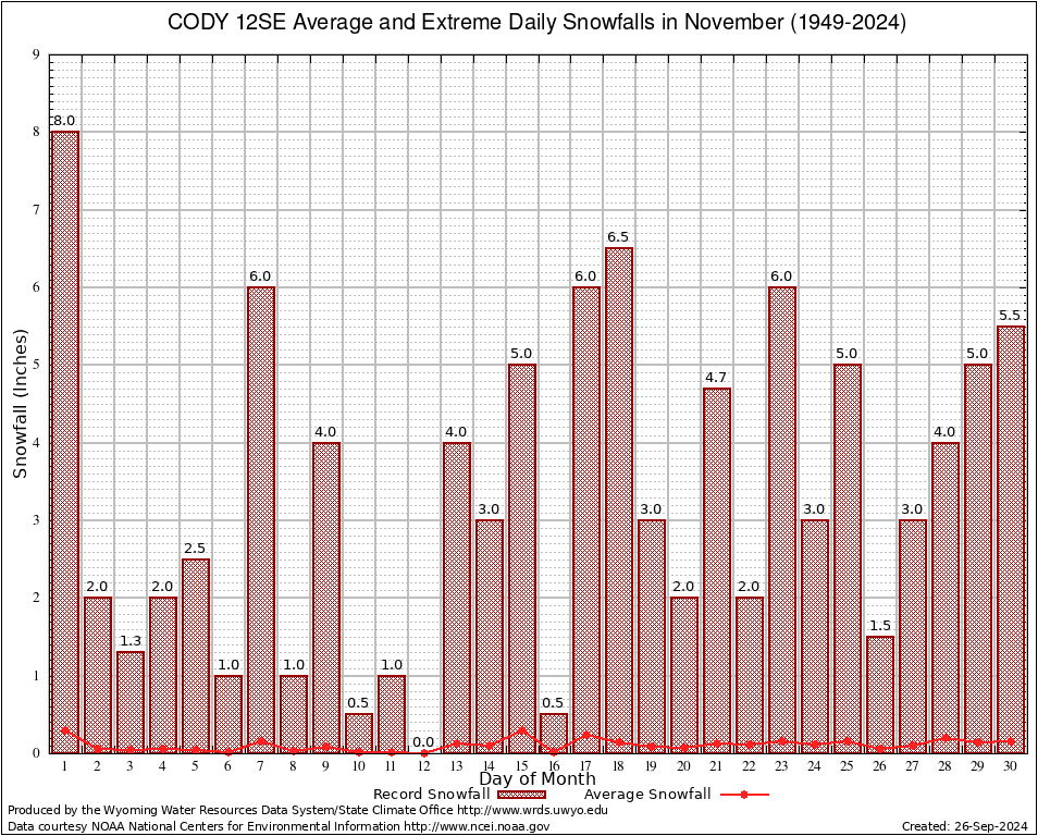 CODY 12SE (481850) November Average and Extreme Daily Snowfall AMounts (1949-2024) To index page for CODY 12SE