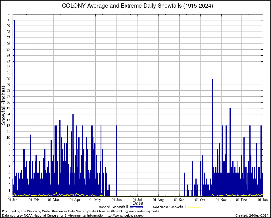 COLONY (481905) Annual Average and Extreme Daily Snowfall AMounts (1915-2024) To index page for COLONY