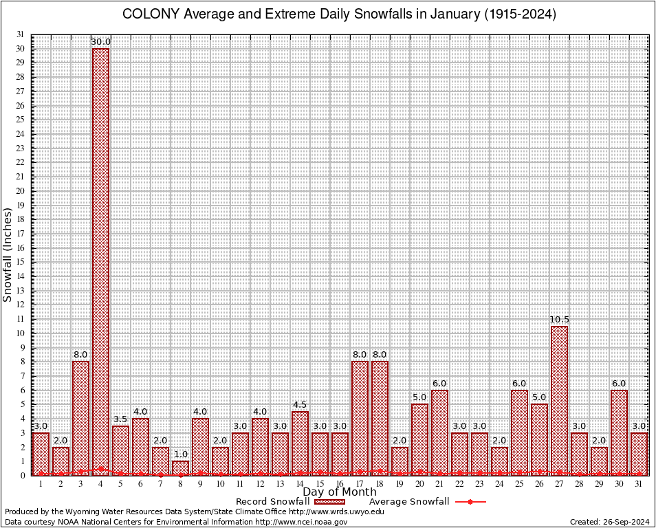 COLONY (481905) January Average and Extreme Daily Snowfall AMounts (1915-2024) To index page for COLONY