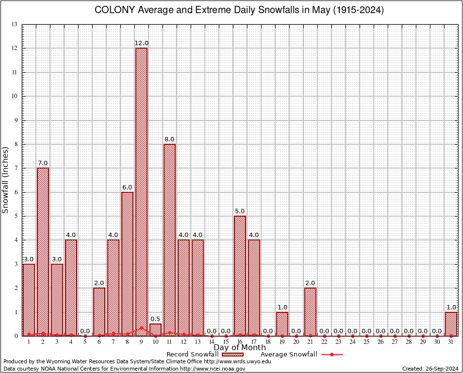 COLONY (481905) May Average and Extreme Daily Snowfall AMounts (1915-2024) To index page for COLONY