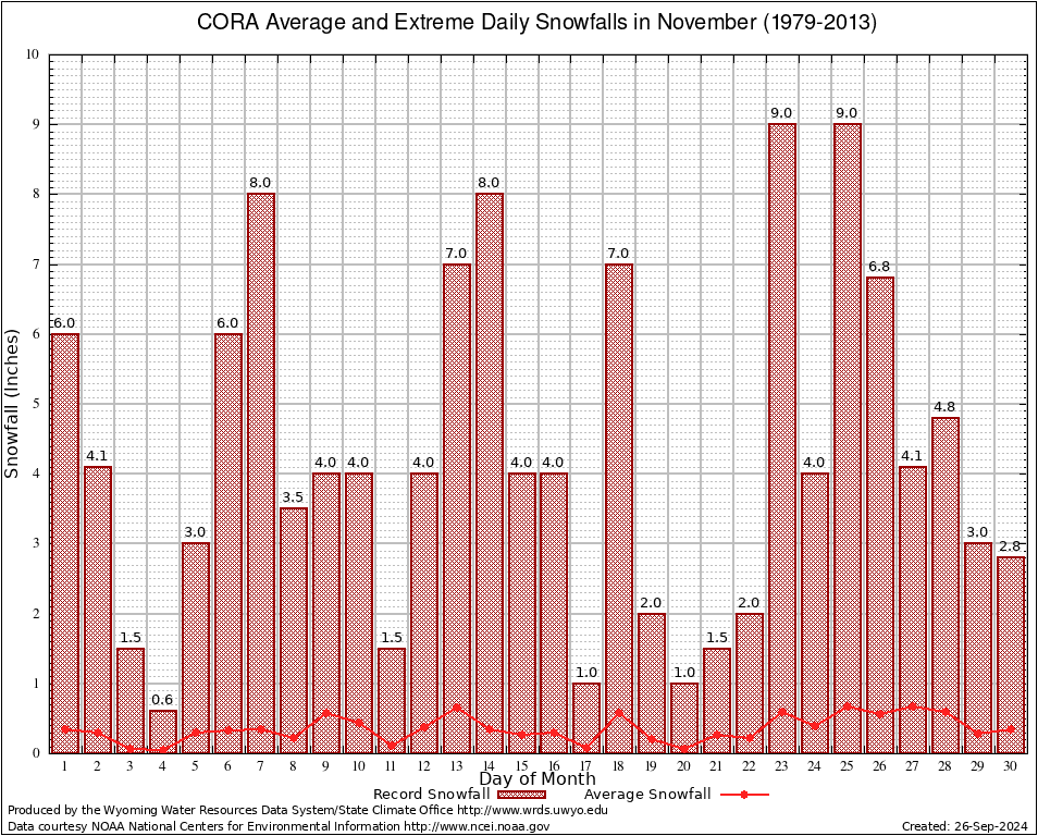 CORA (482054) November Average and Extreme Daily Snowfall AMounts (1979-2013) To index page for CORA