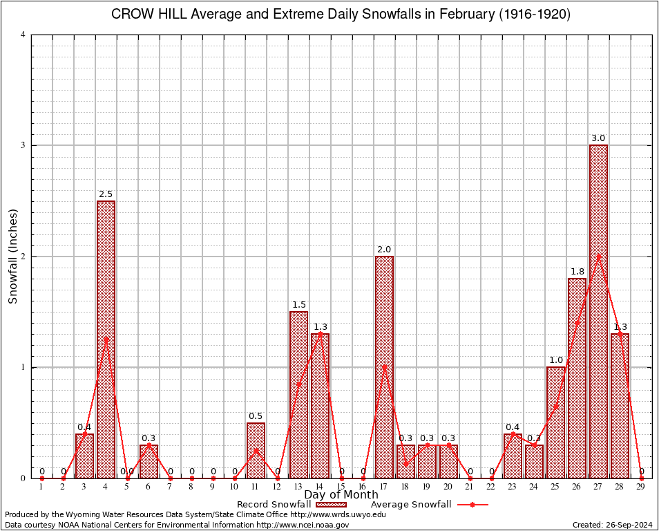 CROW HILL (482230) February Average and Extreme Daily Snowfall AMounts (1916-1920) To index page for CROW HILL