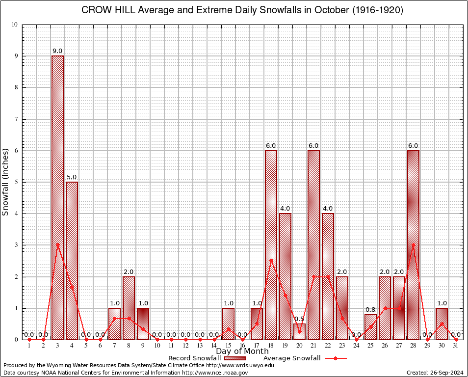 CROW HILL (482230) October Average and Extreme Daily Snowfall AMounts (1916-1920) To index page for CROW HILL