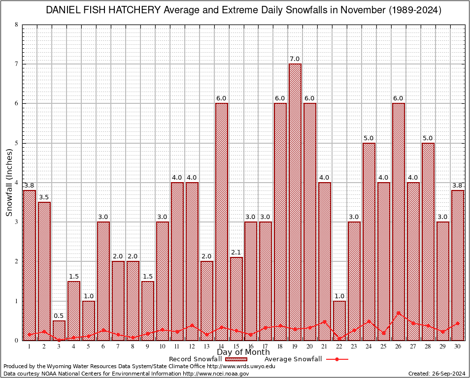November Average and Extreme Daily Snowfall AMounts (1989-2024)