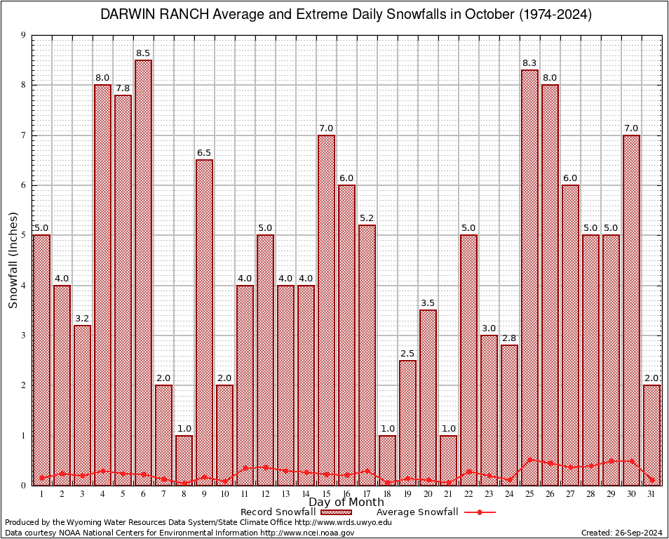 October Average and Extreme Daily Snowfall AMounts (1974-2024)