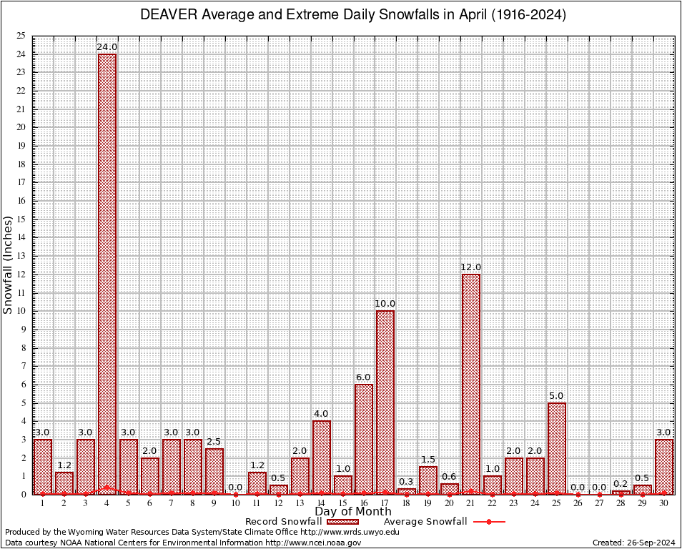 DEAVER (482415) April Average and Extreme Daily Snowfall AMounts (1916-2024) To index page for DEAVER