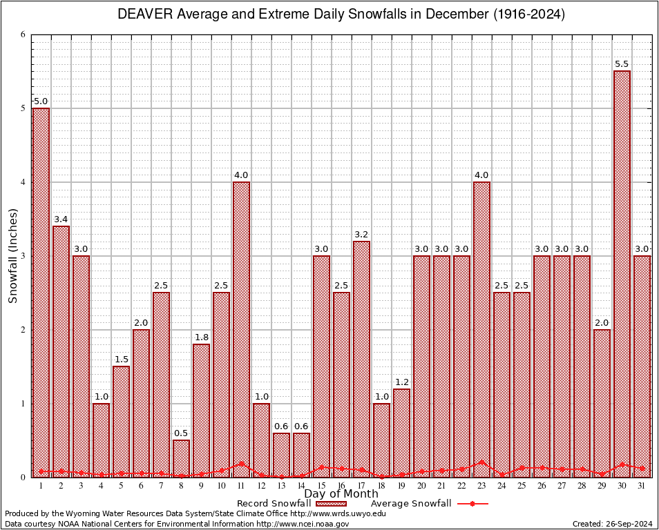 DEAVER (482415) December Average and Extreme Daily Snowfall AMounts (1916-2024) To index page for DEAVER