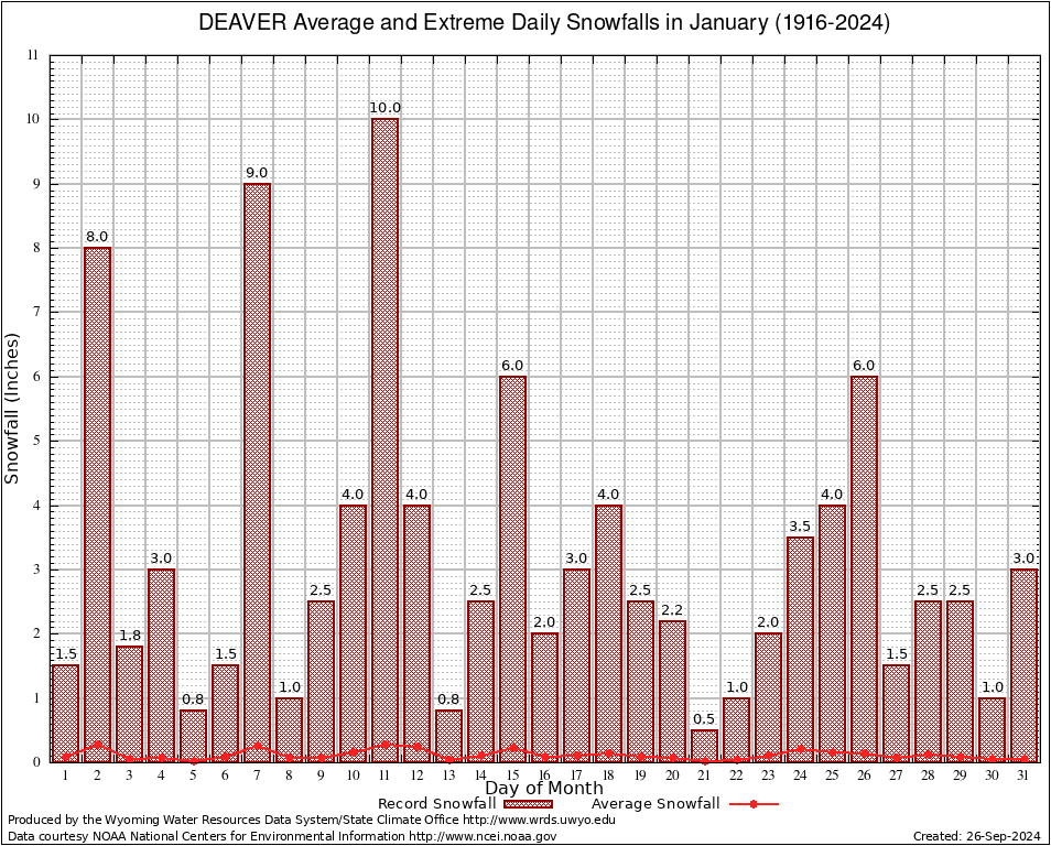 DEAVER (482415) January Average and Extreme Daily Snowfall AMounts (1916-2024) To index page for DEAVER