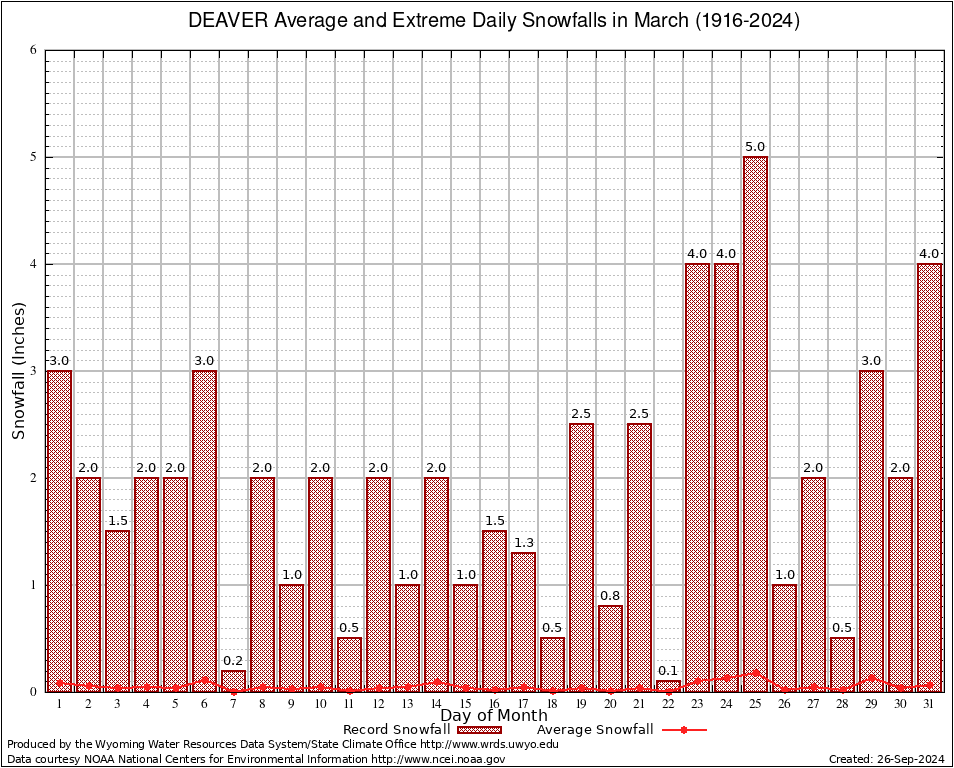 DEAVER (482415) March Average and Extreme Daily Snowfall AMounts (1916-2024) To index page for DEAVER