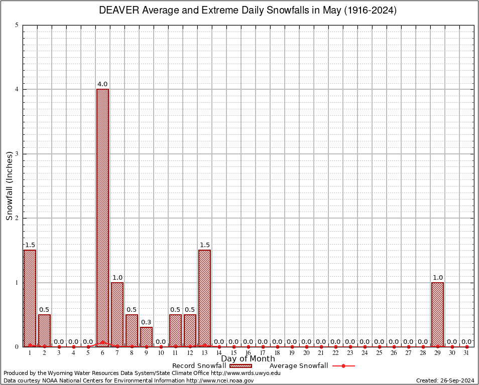 DEAVER (482415) May Average and Extreme Daily Snowfall AMounts (1916-2024) To index page for DEAVER
