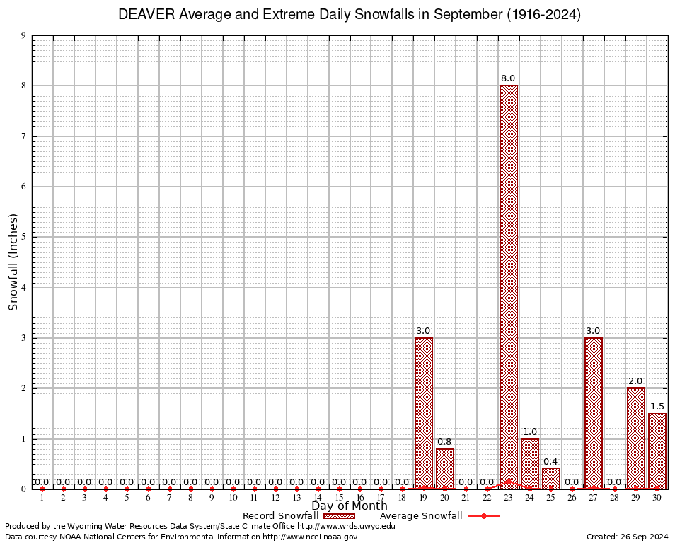 DEAVER (482415) September Average and Extreme Daily Snowfall AMounts (1916-2024) To index page for DEAVER