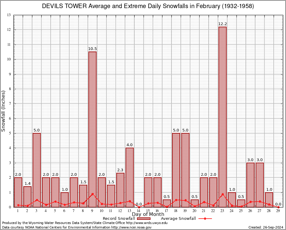 February Average and Extreme Daily Snowfall AMounts (1932-1958)