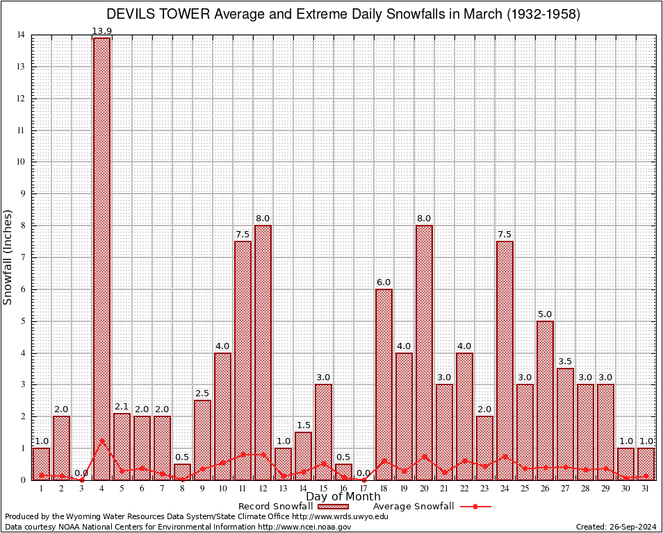 March Average and Extreme Daily Snowfall AMounts (1932-1958)