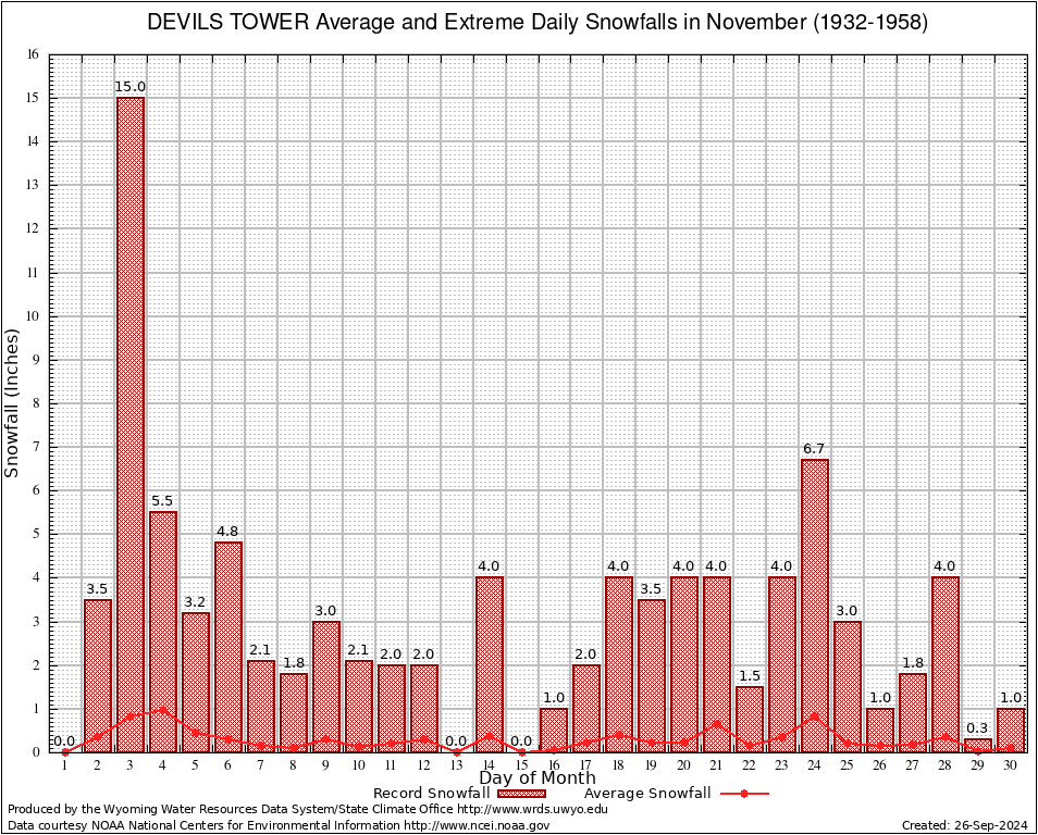 November Average and Extreme Daily Snowfall AMounts (1932-1958)