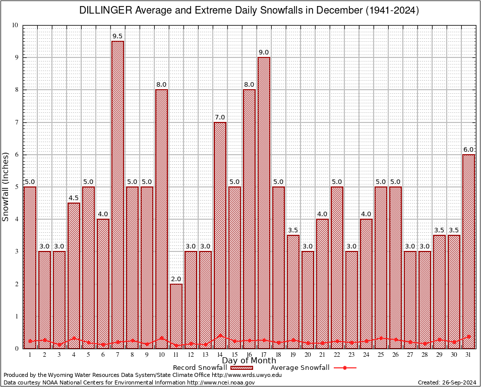 DILLINGER (482580) December Average and Extreme Daily Snowfall AMounts (1941-2024) To index page for DILLINGER