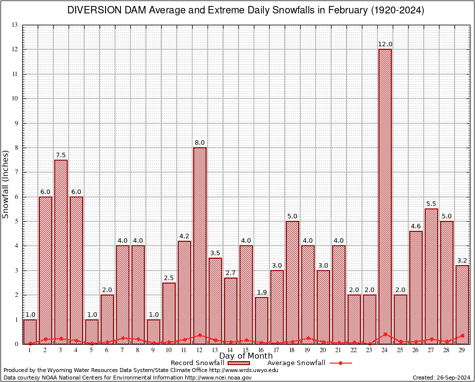 February Average and Extreme Daily Snowfall AMounts (1920-2024)