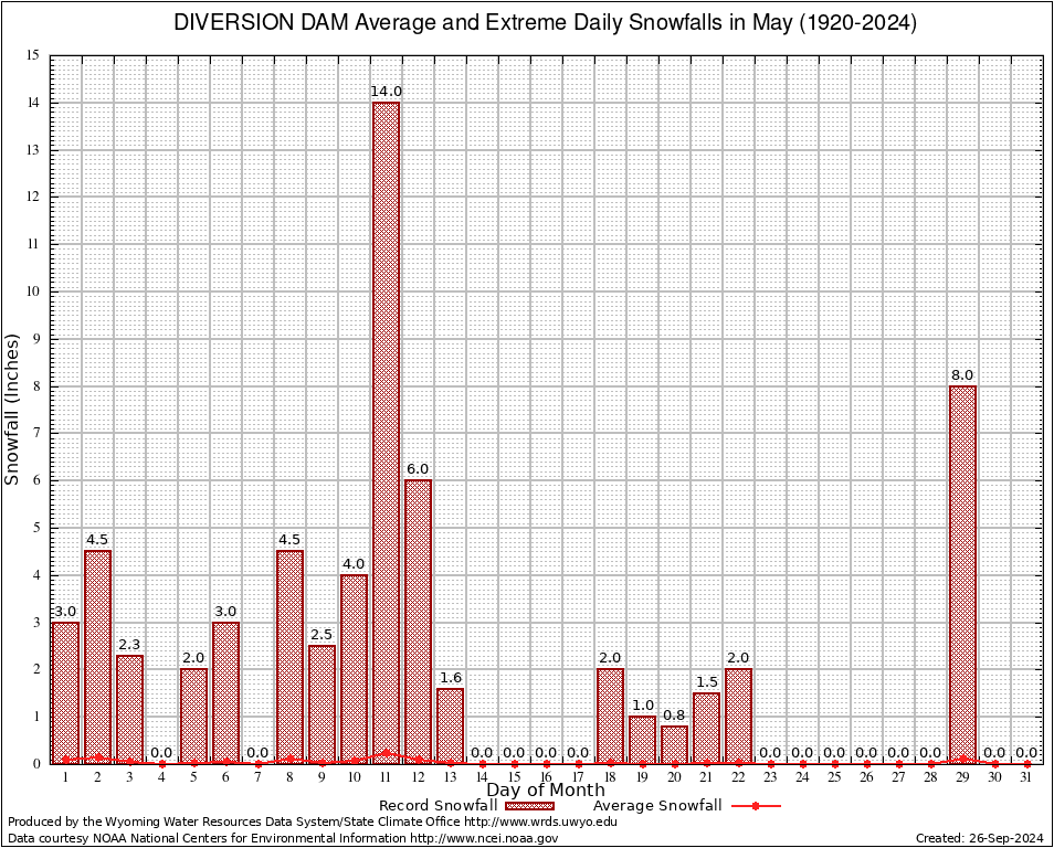 May Average and Extreme Daily Snowfall AMounts (1920-2024)