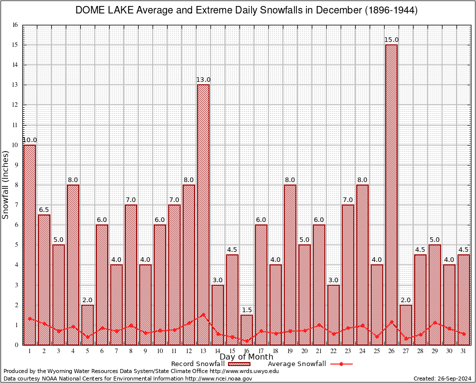DOME LAKE (482638) December Average and Extreme Daily Snowfall AMounts (1896-1944) To index page for DOME LAKE