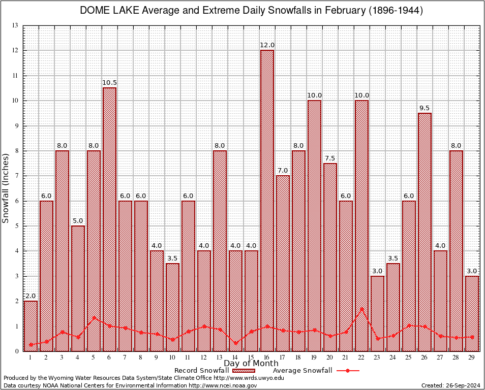 DOME LAKE (482638) February Average and Extreme Daily Snowfall AMounts (1896-1944) To index page for DOME LAKE