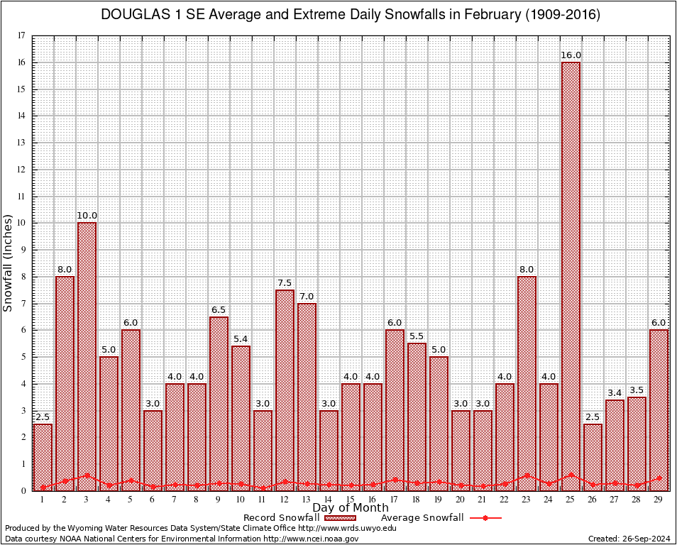 February Average and Extreme Daily Snowfall AMounts (1909-2016)