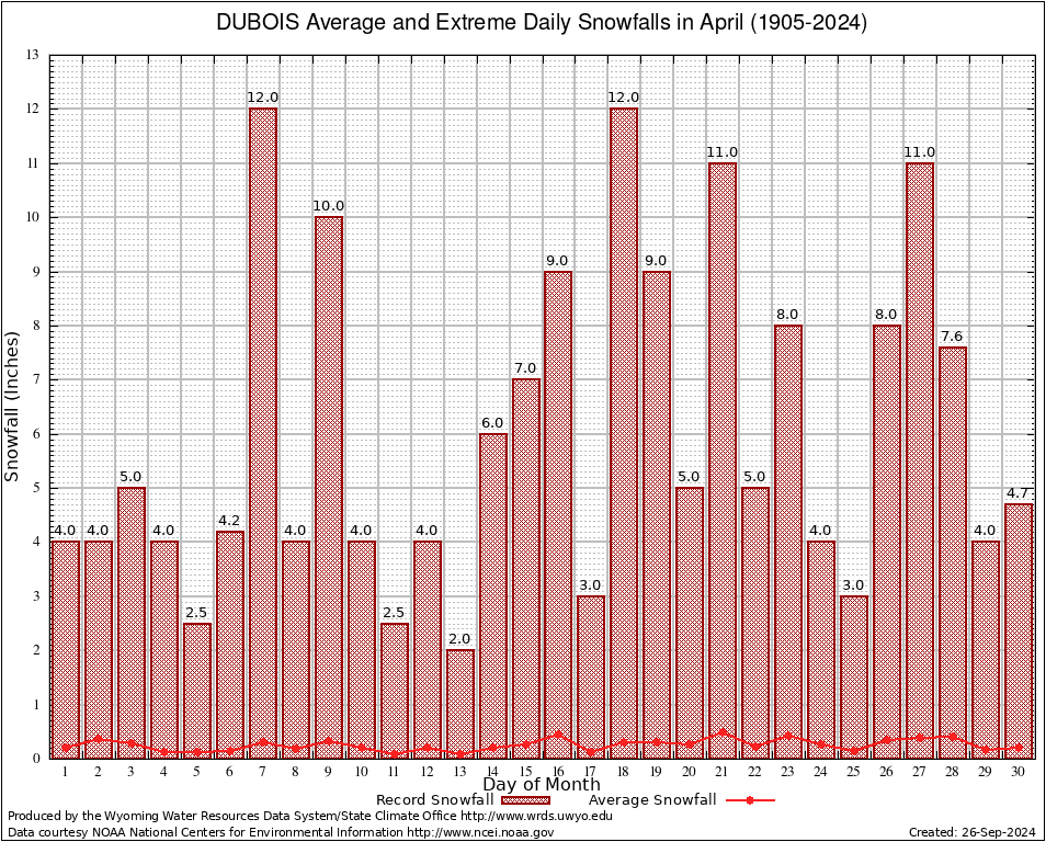 DUBOIS (482715) April Average and Extreme Daily Snowfall AMounts (1905-2024) To index page for DUBOIS