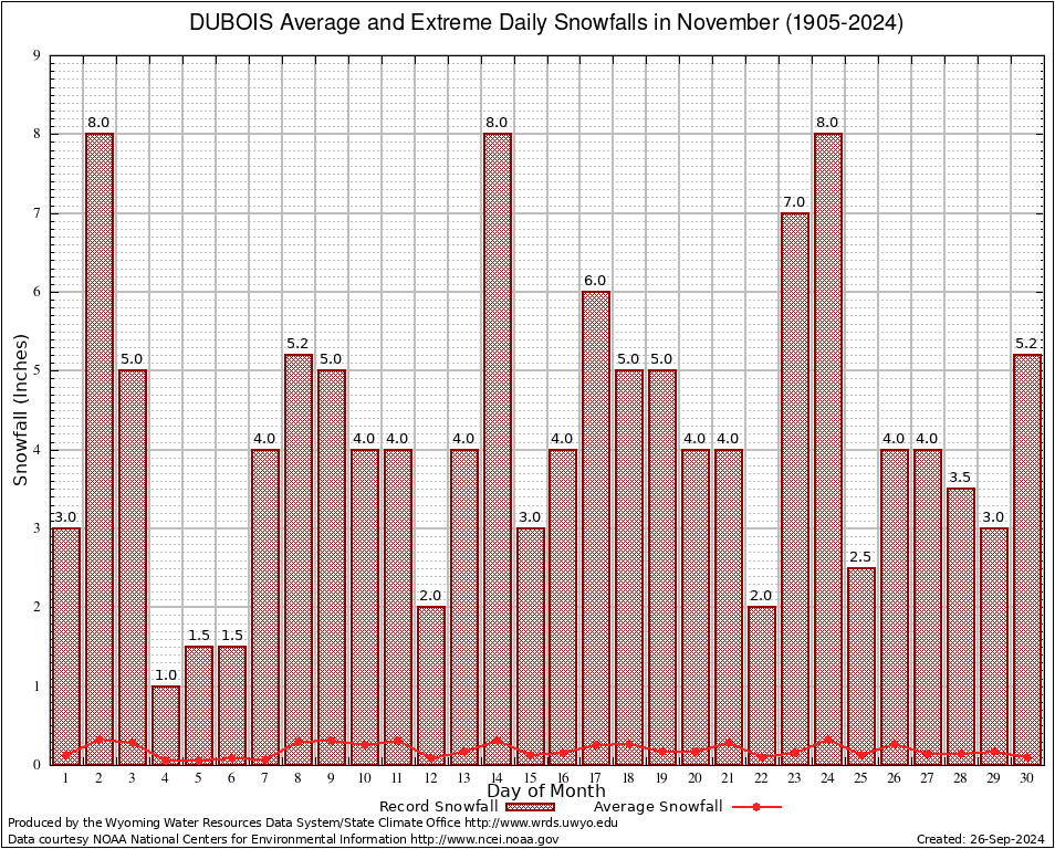 DUBOIS (482715) November Average and Extreme Daily Snowfall AMounts (1905-2024) To index page for DUBOIS