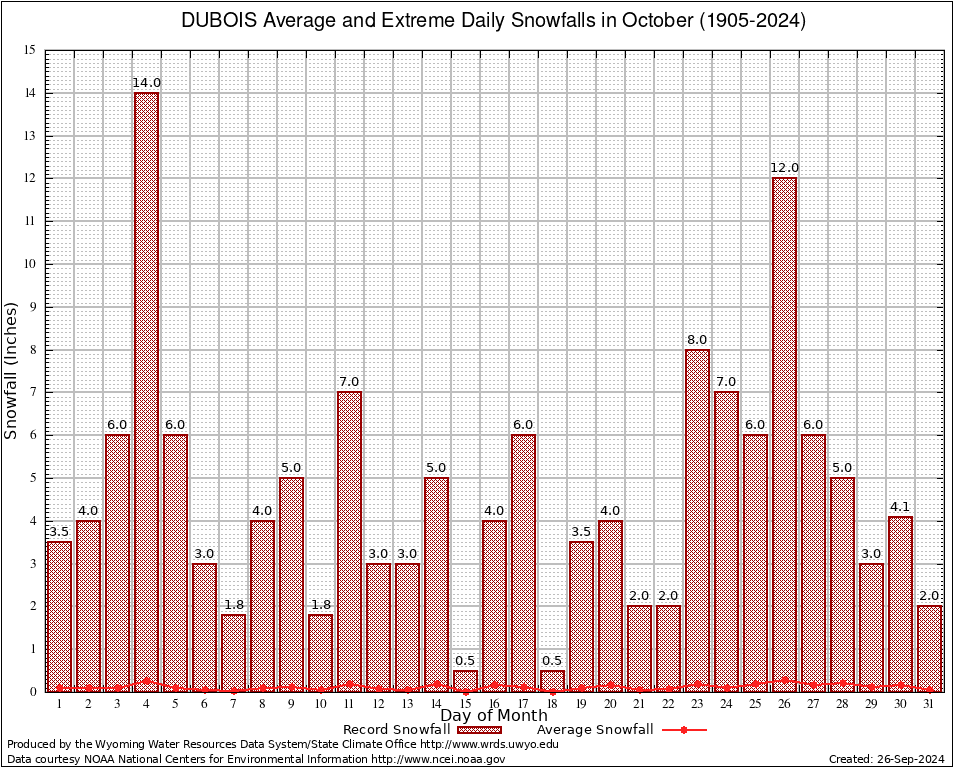 DUBOIS (482715) October Average and Extreme Daily Snowfall AMounts (1905-2024) To index page for DUBOIS